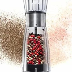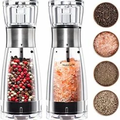 - ?Unique Design, Contemporary Look: BPA-free acrylic bottle body , premium material, this pepper mill is more durable and looks more elegant in your kitchen. Tightly sealed lid keeps your sea salt, peppercorn medley, spices fresh and by keeping out moisture.