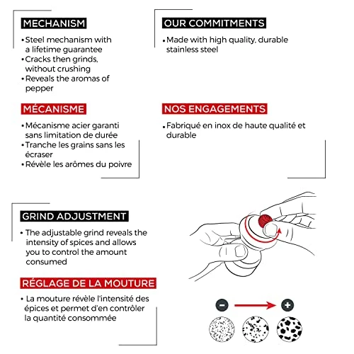 - The pepper mechanism is equipped with a helix-shaped double row of teeth that guide and hold the peppercorns for a perfect grind. It has a patented treatment that protects the steel from corrosion