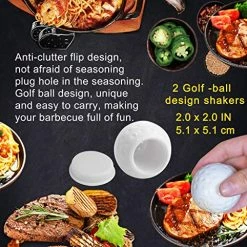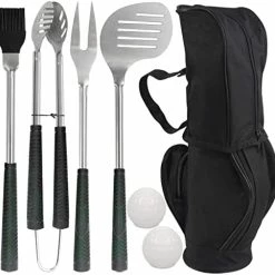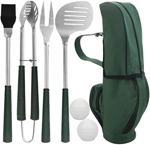 - Unique and Basic Golfers grill set: The 7pcs golf bbq kit includes golf-club style barbecue spatula, power tongs, grill fork, 2 Golf-Ball Style salt & pepper shaker, silicone basting brush and golf storage bag.