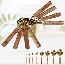 Iβm obsessed with this set of measuring cups and spoons! I was pleasantly surprised when I unboxed them. They are very sturdy and the quality of the wooden handles are spot on. Adds a touch of class to my kitchen. The brass color is not the βshiny brassβ and I donβt want to hid in a drawer! I highly recommend and would purchase many times over for gifts.
