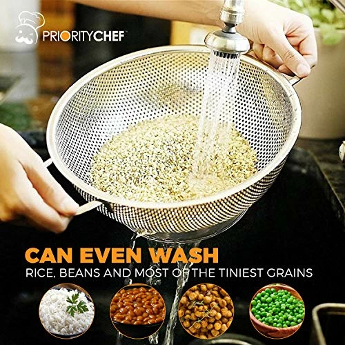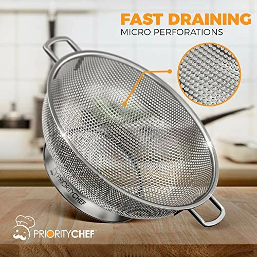 - Ergonomic Design – Here at Priority Chef we believe that your maximum convenience should be our first priority. For that reason we created a kitchen strainer with durable handles that can provide a hands free drainage when placed above the sink or into a larger pot!