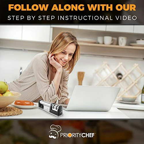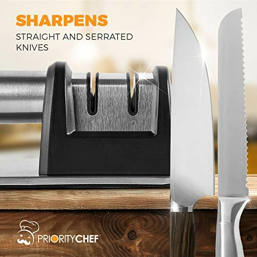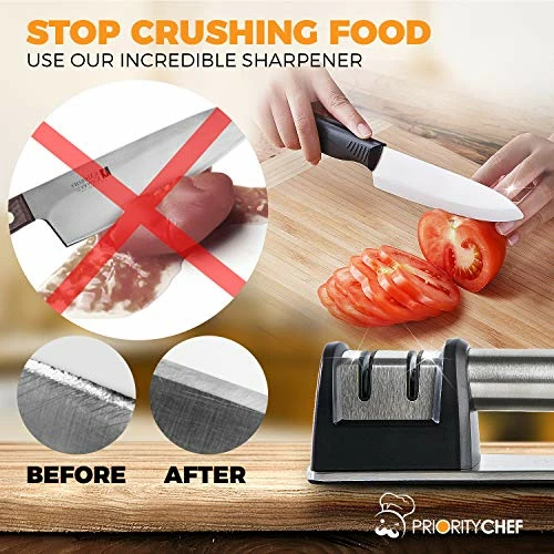 Your priorities may vary from mine. I don’t want an expensive motorized sharpener. My blades are sharp enough that I delude thinking someday I will need one – but not now. It was a great price on a food processor and Blender that made me think, “I’ve money for a sharpener.” Amazon saved me money, and I denote this in tribute.I researched online to learn how to sharpen blades. I found no solace in Priority Chef’s Manual. How much pressure is needed? Pull fast or slow? Do I flip the grip to the other hand and continue the process? What we have here is either a very affordable non-motorized sharpener or a faulty product. How do we know if the blade is sharp as it will for this product?Us old folks (cough) know the commercials for sharpeners where they were tested on paper. I devised a before and after paper envelope test.The manual advises running a blade straight through 5 or 7 times to 10 times to do the job. Recall the questions above to see that running through x times does not give enough information. The stone inside spins. Is mine defective? To my test, I did as advised and was able to slice the paper a little better than say the week before I had it. The edge didn’t strike fear of cutting my finger. It didn’t remind me of them old commercials where it passes through the paper with ease. I repeated with no wow! effect. So, I changed the test.I switched the grip passing it x-times in the Course then Fine notch to give balance. It cut better than the previous week dullness. I repeated seeing the pencil-shaving metal obviously coming off the application. Eventually, I did the finger test with a little pressure giving me a nasty paper cut. Still, it was not sharp enough for me to sing, “I’m the barber of Seville” like Alfalfa from “Little Rascals” and feel I could shave myself sharp.I am saying is that I am one of those who had knives sharp enough to do the jobs, but felt the blades could be sharper. I am one that didn’t trust my industrial grinding stones — but occasionally used them out of desperation yet have seen how nice knives can be misshapen by inexperienced. Priority Chef needs better instructions; there are millions of us in America who haven’t any sharpener.In short, this is affordable, but the manual could be better. A site with how to use it would be inexpensive cost to providing a quality item at a decent price. ($16 for me) Manufacture, make your Manual User-Friendly. Do you think the seasoned sharpener will buy a less expensive product or go to motorized?I submit to you: we naive, dare-to-eat-a-peach buyers will “go cheap” before we spend big money.Educate us on your product, and you may see excited consumers and word of mouth rise in a community of non-knife sharpeners out rank the experienced sharpeners.(NOTE: I give evaluations, for I read others for insight. I am Paying It Forward with great gratitude)