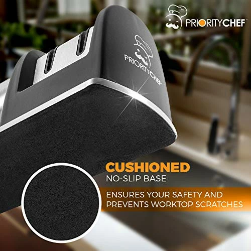 - Stylish, Ergonomic Design And Durable Construction. With its 2-stage sharpening system, you can polish your blades to razor-sharpness. This product is also designed for comfort. The non-slip cushion at its bottom offers a more vibrator base while its ergonomic handle provides a comfortable, easy grip. Itβs the perfect complement in most kitchens!