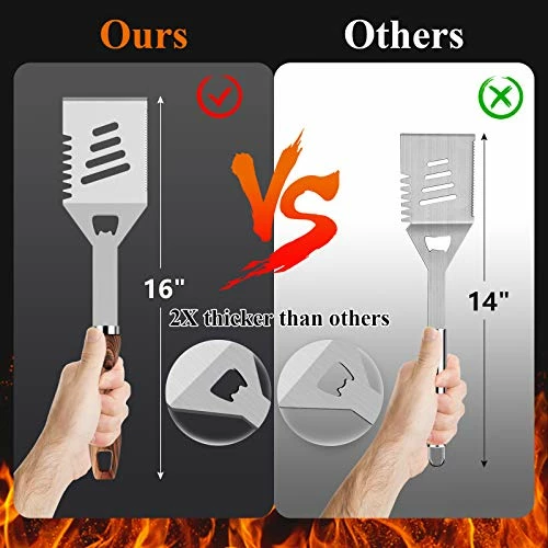 - 【EXTRA-THICK & QUALITY MATERIAL】— This professional BBQ grilling set made of quality stainless steel material which are extra thick and hold up well for constant grilling practices, Will withstands heat, rust and cracks, Every item in this kit is substantial, sturdy and durable, The handles are elongated for a safe BBQ. They are long enough to keep a safe distance from fire and do the job. All the barbecue tools are well made and made to last