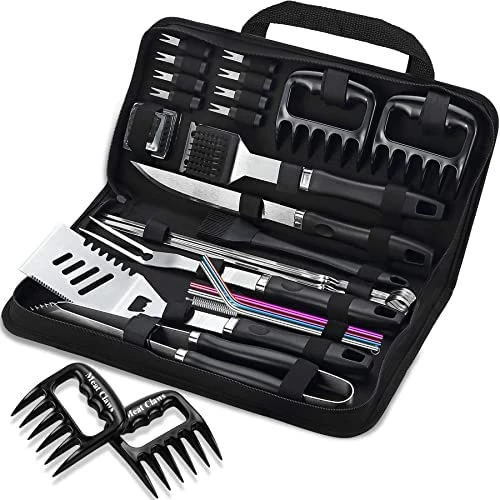 - 【COMPLETE & FUNCTIONABLE BBQ TOOL SET】— Our 27pcs complete grill tools set comes with all essential BBQ utensils and every item is functionable, Includes 1* Long handled power tongs, 1*multi-purpose spatula with built-in bottle opener, 1*Grill fork, 1*Sharp knife,1*Basting brush,1*Cleaning brush with scraper,1*Extra brush head,2*Meat claws, 4*BBQ skewers, 8*Corn holders,1*Reusable straw sets(2*Rainbow straw,2*Silver straw,1*Straw cleaning brush), 1* Durable zipper bag