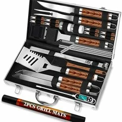 - MOST COMPLETE AND VERSATILE BARBECUE SET: Our 31pcs professional grill utensils set includes nearly everything you need for a barbecue. 1* Slotted spatula, 1*Fork, 1*Tongs,1*Knife,1*Basting brush,1*Meat thermometer, 1*Meat injector,1*Grill brush, 1*Extra cleaning head,2*Shakers for pepper & salt,2*Grill mats, 4*Skewers, 8*Corn holders,1* Stainless steel drinking straw set (includes 4*reusable straws and 1*cleaning brush), 1*Aluminum case for easy storage.
