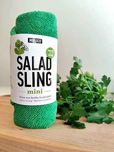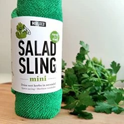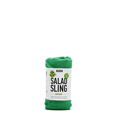 Say goodbye to bulky, annoying-to-wash salad spinners! The Salad Sling Mini dries greens and herbs in seconds, folds up for easy storage and is machine washable. Simply place wet greens in the center of the sling, gather up the handles and swing it in a circle for a few seconds. Centrifugal force pulls the moisture away from the greens and into the super-absorbent microfiber towel. An inner waterproof barrier keeps the moisture contained and off your walls and ceiling. A smaller version of the full-size Salad Sling, the Salad Sling Mini is perfect for herbs, berries, or small salads. It’s also reversible – after “slinging” simply flip it over to the dry side to repeat the process. Product details: Size: 19 inches x 19 inches. Main fabric: 88% polyester, 12% nylon. Lining: 100% polyester. Laminate: 100% polyurethane. Machine washable with like colors. Tumble dry low. BPA Free. Meets all FDA and CA Proposition 65 standards for food safety. U.S. Patent No. 10,767,928. Made in China.