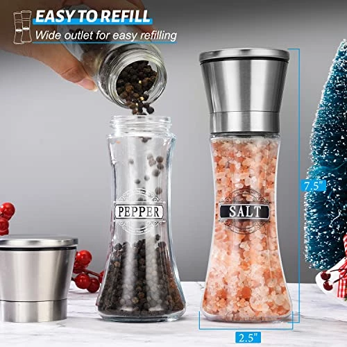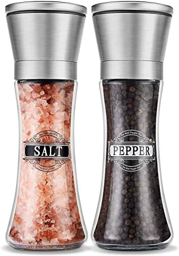 - β γPepper Grinder Set with Stainless Steel Dust CapγMade of high quality glass and stainless steel,salt and pepper grinder set is durable and easy to hold while ensuring no rust.The dust cap on the top of the pepper mill prevents the addition of dust and moisture, keeping your salt, pepper fresher more effectively. *Salt and pepper not included.