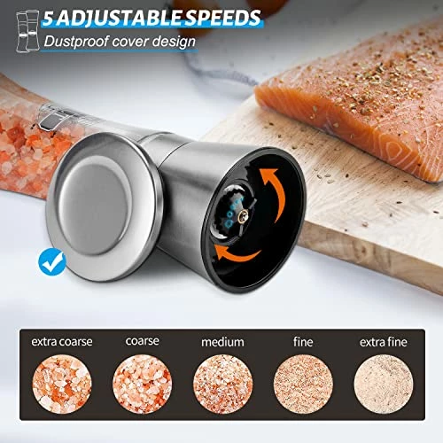 - β γAdjustable Coarseness Salt Grinder SetγWith five levels of adjustable coarseness settings, it’s easy to get the coarseness of salt and pepper you want by simply twisting the button on the top of the salt mill. From coarse, to medium, to fine, for all your needs. Suitable for all types of salt,pepper and other spices β.