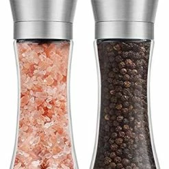 Very nice glass base salt and pepper grinder set. The grinding unit may need a little improvement as the unit using for salt seems to grind it only into a fine powder norther what adjustments I try. I can’t seem to get a course grind on the one grinder. All in all I like these grinders and they are a nice addition to my kitchen