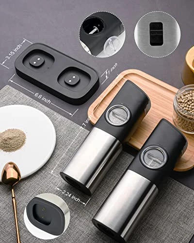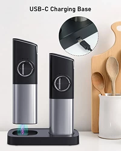 The griders are gravity activated so all you need to do is tilt the stainless steel unit and you get perfectly ground salt and pepper everytime. Best of all there are no batteries to fiddle with or replace as this set comes with an included USB-C charging base. This modern looking electric grinder has an easy fill door making it perfect for pepper, salt and other solid grain seasonings and is a must have for anyone that love to cook!