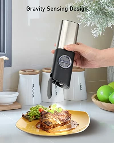 - [Gravity Automatic Operation]:The electric pepper grinder is gravity activated , NOT even to press a button, Just simply turn the grinder upside down and you will have fresh ground spices, Convenient and funny.