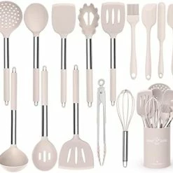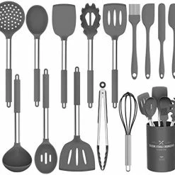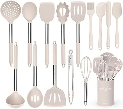 - β 15 PREMIUM KITCHEN UTENSILS SET: 15 professional silicon Kitchen Utensil set includes slotted turner, solid turner, deep soup ladle, pasta server, flexible spatula, spoon spatula, spreader spatula, slotted spatula, bating brush, egg whisk, slotted spoon, solid spoon, kitchen tongs and holder. Meet your all kinds of kitchen needs