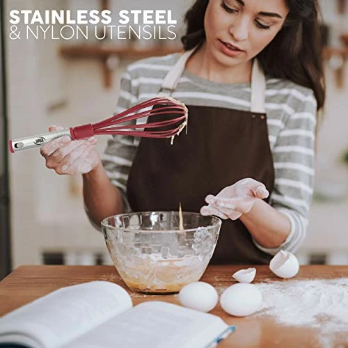 - LASTS A LIFETIME: No more worries about melting or rusty utensils! Our high-quality Baking utensils are made of heavy-duty, non-flimsy, nylon material, polished with a special oil to prevent it from getting rusty . They are Dishwasher safe – Light-weight – Non-stick – Heat resistant is up to 350 F/180โ – Great for pots and pans.