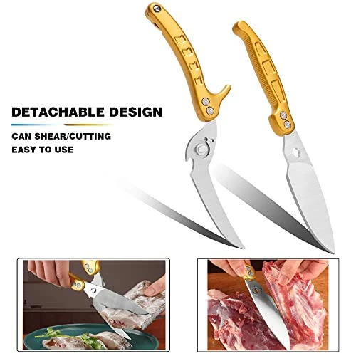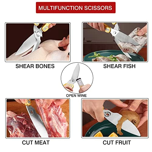 - γMUCH SAFER & CONVENIENT KITCHEN SCISSORSγThe stainless steel kitchen chicken scissors come with a safety lock design is much safer and more convenient during cutting chicken, meat, vegetable. And the kitchen poultry scissors save your time between switching the knife and other kitchen tools. The kitchen chicken scissors have great flexibility and operability. You will find the professional kitchen poultry scissors are more convenient and maneuverable than a knife or cutter.