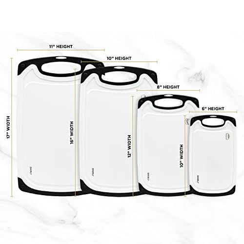 - β Designed to Simplify Your Life – We’ve taken the best elements of all available plastic cutting boards on the market and created a product designed to save you time and make your experience in the kitchen fun. Easy grip handles, label icons, and built-in juice groove make our set of 4 chopping boards for kitchen use the best in the business.