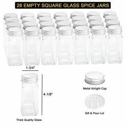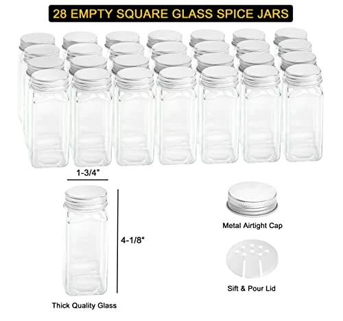 - 28 Glass Spice Jars – Made of lead-free durable glass; Feature sift and pour lids allow you either shaking or measuring with spoons, metal airtight caps keep your spices stay fresher longer; The funnel makes adding spices mess-free
