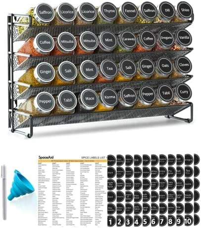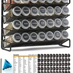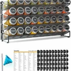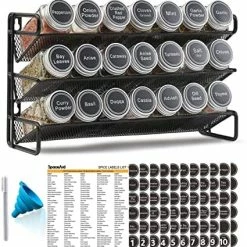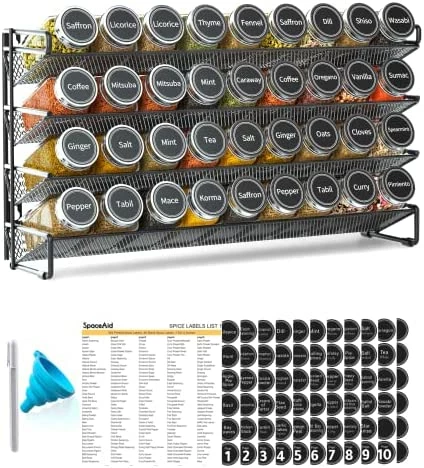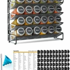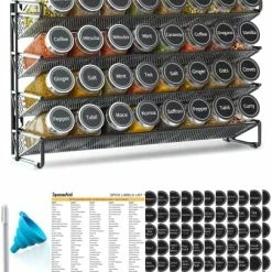 Having purchased various spice racks through the years, of various types (rotating, chrome looking, etc.), this is BY FAR the best set yet. Why:1) This set comes with a gazillion of black spice label stickers with spice names legibly printed in white (some with spice names I never used before – like Biryani seasoning, which now I will have to try!). This set also comes with a generous amount of blank black stickers and a white marker, so you can have labels for spices that there aren’t pre-printed names for. For example of how complete the pre-printed spice names are, I use Japanese 7 spice which is also known as Shichimi Togarashi, and the set actually has a pre-printed label for Shichimi Togarashi! There was also a pre-printed label for Garam Masala and for Nutritional Yeast. There are labels for different sorts of Paprika, etc. In other words, there are waaaaaaay more labels than bottles. I used some of the blank labels to make a label for Shawarma and for ‘Everything-But-The-Bagel’ seasonings. The white marker provided actually wrote easily and was fine-tipped and the white ink was thick enough that it shows from a distance and the look great sitting next to bottles with pre-printed stickers, so that is an example of the thoughtfulness that the manufacturer’s showed in putting together this set.2) Because there are soooo many pre-printed spice name stickers, to make it easy for the customer, the manufacturer even included a spice name cheat-sheet, so that it’s easy to find the pre-printed sticker you want in the 10 PAGES of pre-printed spice name stickers (and to know if what you want simply isn’t there so you have to use one of the provided blank stickers instead). The cheat-sheet tells you which of the 10 pages you’ll find the sticker you want on (and each of the 10 pages clearly has the page number in the bottom right hand corner, so it doesn’t matter if you get the pages out of order). Again, thoughtfully done.3) The spice name sticker material itself is a thoughtful choice too! -Which I know is hard to imagine, but here is why: The spice name stickers are kind of like the re-usable stickers we had as kids, where you can stick them on metal and then pull them off and restick them somewhere else again. Brilliant! That way you can reposition the spice name sticker or even change the spice name sticker altogether to a different spice name. Absolutely thoughtful. Well done! Bravo!4) The bottle lids make sense too. The bottle lids are two pieces – a plastic shield under a twist-on cap. Detail: There is a removable plastic ‘shield’ type lid that has the typical small sprinkle size holes on one side and a pour hole on the other side, and that plastic shield fits snugly over the jar. Then OVER the plastic shield is an entirely separate twist on/off metal (yes metal) lid. I was wondering at first about ?why metal? and then intuited that by having metal lids those reusable stickers can be most easily peeled off and replaced with other spice label stickers ๐ Hopefully the lids won’t rust or anything like that over time, but out the gate I’d say I love the metal lids because it makes those great replaceable spice name stickers possible, so I’m all for it (if I see rust in a year ask me again! – but right now, I’m THRILLED). I think having a twist lid over the plastic shield will both keep things fresher, and just as important, solve the problem I’ve had with other spice sets having one-piece lids with ‘hinged’ covers over the spice sprinkle holes (that after awhile the one-piece covers don’t flip securely back into place). Since this set has a metal screw-on lid, the fit should be tight for as long as I have the set.5) Functionality: I have the 4 tier version of the spice rack, and I assumed the rack would be tippy/wobbly if the spice rack wasn’t at least resting against a wall. To my touch, it is not tippy or wobbly even when not resting against/supported by a wall. I don’t know how it would do in an earthquake as a standalone spice rack, but normal use so far hasn’t made it move or sway or anything like that, so I might use it as a visual divider between two areas on a large island and not even put it against a wall at all. I haven’t used the hanging system but the set came with all sorts of stuff for that, but I haven’t tried any of the hanging system. There is plenty of room to slide the bottles on and off the rack, and even some extra room side to side. They didn’t cut corners on the size, the rack size is comfortably generous for the bottles provided. 7 bottles fit on each tier. The bottles are square (as opposed to round) so they don’t roll around. (For curiosity sake I tested a few 2+/- ounce spice bottles I have just to see if they’d fit, and some did, but there’s not much point to using any other spice bottle with the rack since it’s more attractive and functional to solely use the bottles that came with the rack.) The bottles that come with the set are NOT 4 ounce bottles, they are 2 ounce bottles. Detail: If you try to pour spice from a 3 ounce bottle into a bottle from the set, then the 3 ounce bottle contents won’t all pour in (so clearly the bottles that come with the set are not 4 ounce). Spice from a 2 ounce bottle fits just fine into the bottles that came with the set. That’s why I say these are 2 ounces, not 4 ounces. The spice funnel that came with the set works great – just make sure it’s thoroughly dry after washing and before using, and funnel your hottest spices last if (like me) you’re too lazy to wash and wait for the funnel to dry between spices. Again, it was thoughtful of the manufacturer to supply a funnel. If you have a second/third funnel you might wish to sue it also so you can avoid mixing ‘unlike’ spices inadvertently and save time.6) Aesthetic: The overall appearance is nice, in a simple, unassuming way. The rack itself is black and fairly unobtrusive once the bottles are on it. 