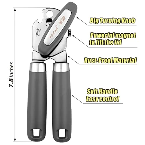 - [Big Turning Knob & Rotund Handles] Ergonomically curved turning knob turns smoothly when cutting through the edge. Soft rotund handles and the anti-slip surface make a comfortable grip. The manual can opener with effort saving design is good for women and seniors with arthritis.