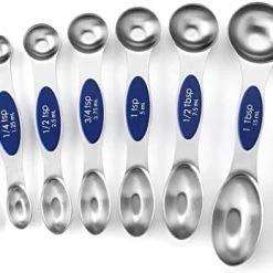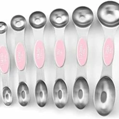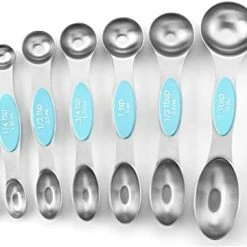 These Spring Chef Magnetic Measuring Spoons are fantastic! If you cook/bake at all, just save yourself the trouble of having to deal with all the random problems of other measuring spoon sets(like having them scattered all over your baking drawer or being stuck together with those blasted rings, having the measurement on the cheap plastic sets become worn off, etc.) JUST GET THESE & you will NOT regret it!! They are sturdy, well made, easy to read & very magnetic(so they will stay together easily in your drawer). I also love that they have a rounded side AND a longer side on each one…so you can easily get into many spice containers. Very nice! I can truly say that these are the best measuring spoons I’ve ever owned & I highly recommend them!
