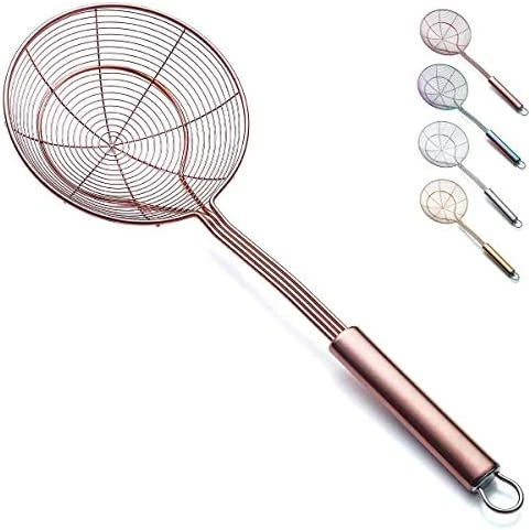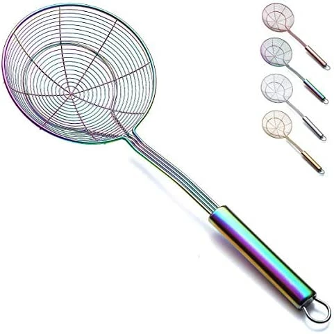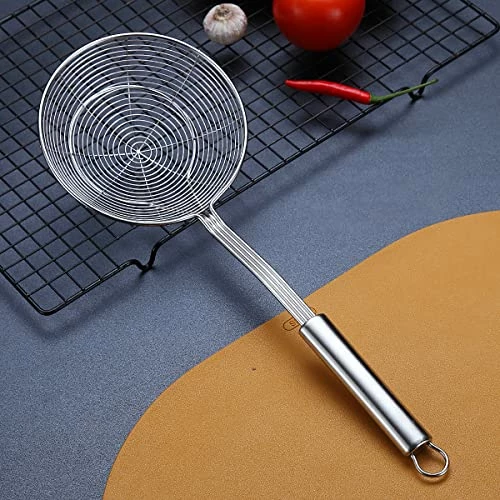 - The strainer spider skimmer is made of high quality stainless steel.It has a mesh cable and a strong outer frame,the handle is not easy to deform even after long term use. It is very strong, safe and durable, and has strong heat resistance and faster than a fine mesh strainer,.It is an indispensable tool for cooking. It also a beautiful decoration of your kitchen.
