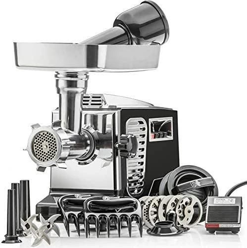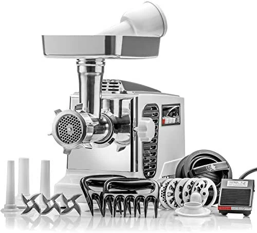 Got to be honest here – really good, durable meat grinders with the power to process a deer or buffalo in one sitting cost about as much as a car payment. And that’d be fine if you have need for something like that. I don’t – maybe a half-dozen times a year, and 20-30 pounds of pork butt at a sitting, so spending $400 to $3,000 on a meat grinder doesn’t make sense. That said, however, I also don’t want to fool with something that I have to jump through a bunch of hoops just to make a few sausage links.I looked pretty carefully at the reviews for this reasonably priced unit, and felt the overall mix of good vs. bad were enough to give it a try. But knowing how these devices work, I wanted to give a really hard look at all aspects of it before actually using it to grind meat.Packaging – “complex jig-saw puzzle” is a fair comparison here. I like to store food processing equipment back in their original packaging between uses to keep everything as clean and pristine as possible. Putting this device and all the trinkets that came with it back in the original packaging is somewhat challenging. The throat and stomper require precise placement in order get the box to closed. I get it that this likely isn’t a big deal to most folks, but I don’t have a dedicated area I can set this up and leave it on my counter, so being able to easily put things back into the original containers for storage is a pretty big deal for me.Documentation – I liked this. A lot. While extolling the virtues of their product, the manufacturer also took pains to call out the device limitations and caveats. They addressed the need to thoroughly clean and dry the steel grinding plates to prevent blackening in pretty good detail. Which leaves me baffled that so many people complained about that very thing in their reviews. Also touched on was the need to let the machine ‘take a breather’ after so many minutes of continuous use in order to prevent a thermal overheat shutdown. The manual gives a pretty comprehensive description of how to most effectively use the machine, and what you can’t do with it. While not offering a LOT of detail, it did describe each piece contained in the carton, and gave a brief overview of what each was for and how each was used. All-in-all, a pretty good user manual.Add-ins – sometimes the number of add-ins is a red flag, especially when there’s a bunch of stuff that doesn’t really relate to the device. I guess I don’t really understand why those nasty-looking meat shredders are included with a meat grinder. Seems a bit superfluous. But the rest were good. There are a number of special-use grinding plates, which I like a lot. While not the heaviest-duty, they’re certainly adequate to my intended uses, and appear to be well made. Three knives were included; most other machines I looked at included just one knife. The sausage-stuffer tubes seem to come standard with every meat grinder these days, but truth be told, they’re kind of worthless for stuffing sausage casings. There’s an interesting-looking attachment that it turns out is used in making stuffed ground meat thingys; gonna have to give that a try one day. Finally, the foot control. This is kind of a big deal. For one, it pretty much keeps you out of trouble with overheating. It’s a BIG help if you’re stuffing sausage casings right out of the grinder. It’s kind of a poor set-up, though. You plug the foot control into an outlet, then plug the grinder into the back of the foot control plug. Its cord isn’t all that long, so you may wind up needing an extension cord. It was BARELY long enough in my case.Grinder/throat/stomper/tray – The stomper is a pretty important piece in meat grinders. It needs to be sturdy, as it takes a lot of abuse, shaped so it fits the hand nicely, and fit tightly into the throat to keep things from squishing past it. This stomper isn’t any of those. It’s a fairly lightweight, hollow plastic that is sized to store the grinding plates inside and has a plastic cap, so it’s big enough that it won’t fit anyone’s hand easily. It works well enough for strips and chunks of meat; haven’t tried it yet with ground meat to see if it’s tight enough to prevent already-ground meat from squishing past it. The tray is lightweight aluminum, but quite sturdy and fits the throat tightly enough that I’m not worried it’ll fall off when it’s loaded down with meat. The throat seems sturdy as far as molded aluminum goes, and the auger and clamping flange are hefty, but also lightweight molded aluminum. As I mentioned earlier, the plates and knives (there are 3) are well made. As the manual points out over and over, none of these components can go into the dishwasher. They all need to be washed by hand with a good anti-bacterial dish soap and dried with a hand towel before storing things away.The plates/knives generate heat while operating, and this heat easily transfers to the auger and throat during continuous operation. To compensate, you need to partially freeze the meat before beginning, and it helps a great deal to put the assembled throat/auger/knife/plate mechanism into the freezer as well. Being frozen didn’t seem to have any effect on how well the machine actually ground the meat, it DID seem to have a significant impact on the motor; getting just a LITTLE too much into the auger at one time really made the motor struggle. Not so much of a problem if you keep the feed rate fairly slow, but then you’re dealing with thawed meat after a time.The control buttons don’t have a clean, crisp feedback to them. The toggling mechanisms for the buttons work well enough, but they have a sticky, mushy feel to them.All-in-all, I’m satisfied JUST enough for me to conclude this machine will fit my needs for sausage making and to keep it. I don’t have any issues with cleaning the components after use; I’m well familiar with the need to wash them by hand with anti-bacterial