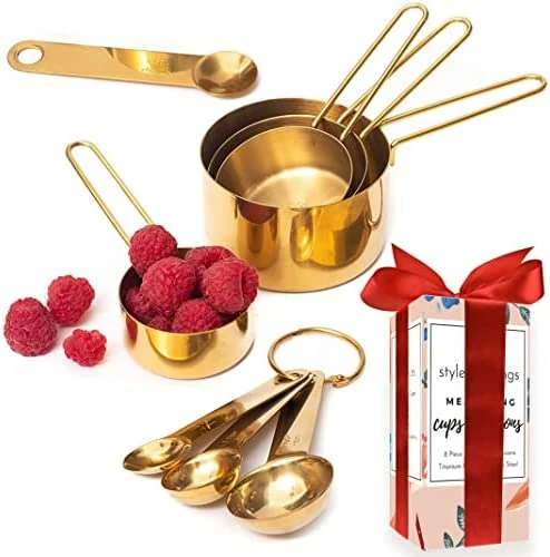 - β A METAL MEASURING CUPS SET YOU NEED β On-trend with gold kitchen decor, an 8-piece set of gold stainless steel measuring cups and spoons set with measurement markings, in sturdy stainless steel will glam up your culinary experiences. The metal measuring cups and metal spoons set is held together with an easy to open gold ring. Comes with 1/4 tsp, 1/2 tsp, 1 tsp and 1 tbsp for the stainless steel measuring spoons and 1/4 cup, 1/2 cup, 1/3 cup and 1-cup measurements for the metal measuring cups