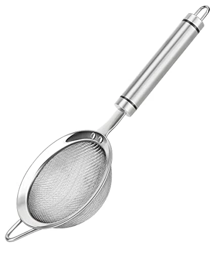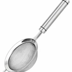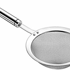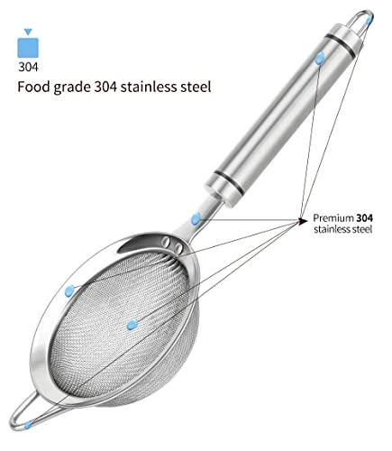- Made from high-quality, food-grade 304 stainless steel. This strainer features a sturdy outer framework and handle. Easy cleaning. Dishwasher safe. Mirrored, burr-free wire mesh screen won’t scratch your hand while you clean it.