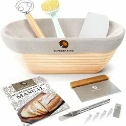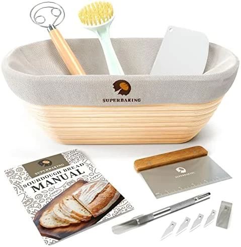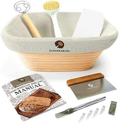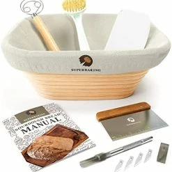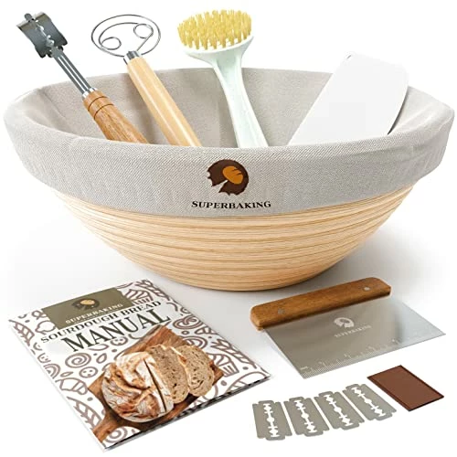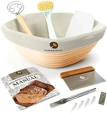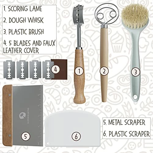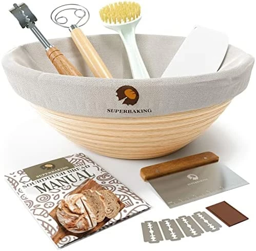 - The Superbaking Guarantee: 100% customer happiness or your money back. The baking set includes bread basket proofing, liner, scoring lame with protector and 5 blades, metal and plastic scrapers, dough whisk, cleaning brush and instructions