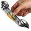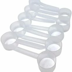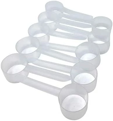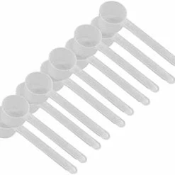 my set came with additional scoops (less than 5cc) which was interesting. It comes with a range of sizes I can use for supplements, crafts, even baking (finally a 2 tsp measure!)Long handles are particularly useful. If at some future time I find they are more in the way than not, trimming them to fit will not be difficult. Each is marked on the bottom with their size in cubic centimeters.Except for the very small sizes, there are only 2 size diameters (larger sizes are deeper rather than wider). A few will nest inside each other, but in no less than 5 stacks. Just be advised there is definitely a space commitment to store them.