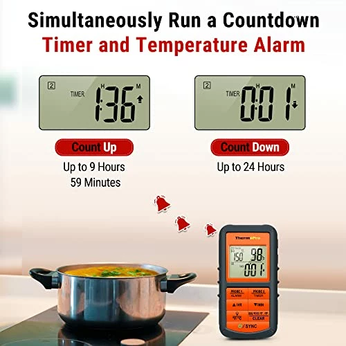 - Convenient kitchen timer: Smoking thermometer features countdown & count up timer which can be used simultaneously with the temperature monitoring functions, helps you keep track of your entire meal from meat to vegetable side dishes