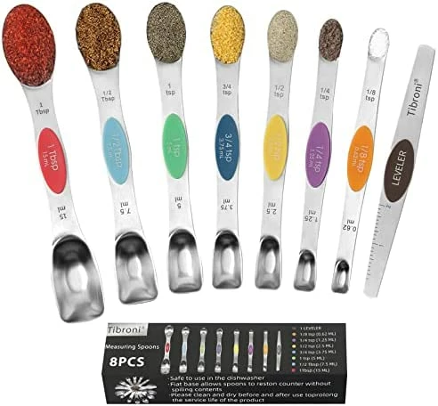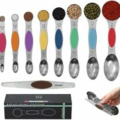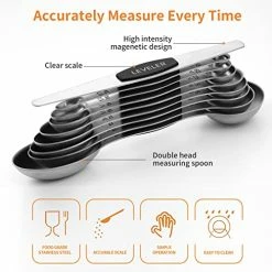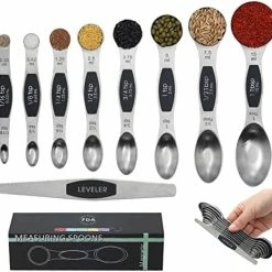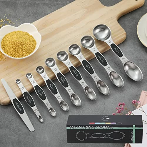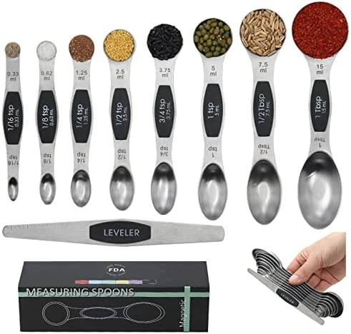- γAccurate Magnetic Measuring Spoons Setγ Metal measuring spoons set with a leveler to help accurately measure, double ended design can be easily used on any bottle mouth.Magnetic measuring spoons with 9 different sizes to satisfy different needs like 1/16, 1/8, 1/4, 1/2, 3/4, 1 tsp, 1/2 Tbsp, 1 Tbsp plus Leveler