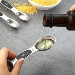 - γDouble Sided Measuring Spoonsγ Double ended design of the measuring spoon makes it compatible for measuring dry and liquid ingredients. The rounded end measures liquid ingredients, and the narrow oval end can be put into most spice jars or bottles. Using the included leveler, you can accurately measure the amount of spices according to the requirements of the recipe, reduce the waste of expensive spices, and save valuable time.