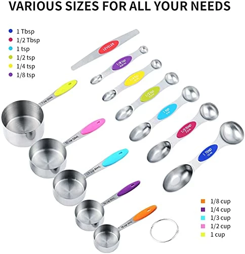 - γPackage includes set of 12γ: 5 different sizes measuring cups (1 cup,1/2 cup, 1/3 cup, 1/4 cup, 1/8 cup), and 6 stainless steel measuring spoons (1 tablespoon, 1 /2 tablespoon, 1 teaspoon, 1/2 teaspoon, 1/4 teaspoon,1/8 teaspoon). Meet All Your Needs On Cooking And Baking.