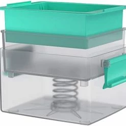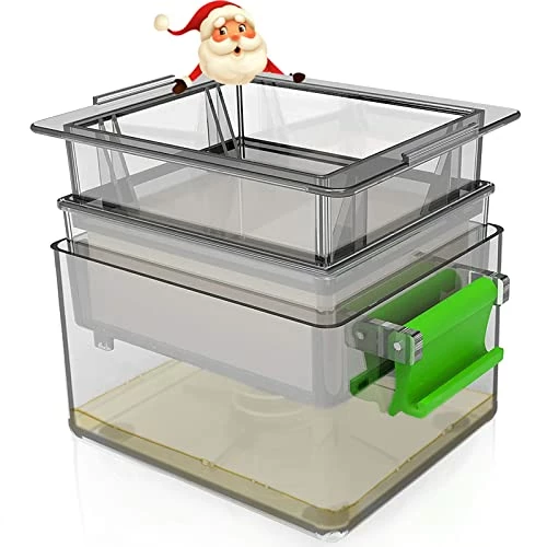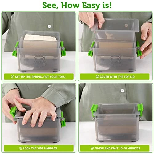 - β EASY TO USE & MESS FREE: Simple three-piece design and Just in 3 steps. 1)Set up the spring in the Water Collecting Tray. 2)Put your tofu into the Middle Strainer;3)Cover with the Top Lid and lock Handles. When pressing, your tofu is in been put in the strainer box, which helps to keep its shape as intact, so it will not get mess.