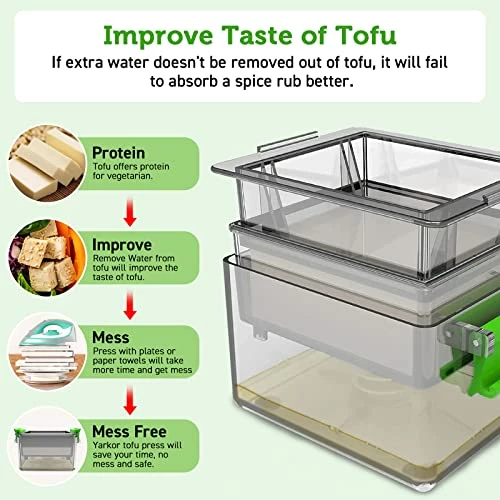 - β IMPROVE TASTE OF TOFU: Tofu absorbs a lot of water in it like a sponge. If extra water doesn’t be removed out of tofu, it will fail to absorb a spice rub better. To enjoy a better texture and flavor of tofu, just press out extra water from it. Yarkor tofu press is compact and exquisite, you can put it into frigerator to keep it cool and fresh while pressing.