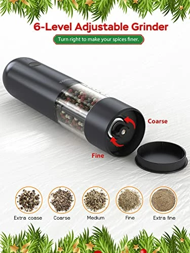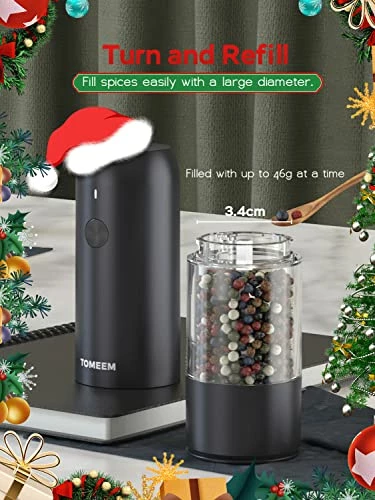 - [Cool Kitchen Gadget Gift] Grinding spices including black pepper, white pepper, salt, Himalayan salt, red pepper flakes, rosemary, anise seeds, flax seeds, and cumin seeds effortlessly, TOMEEM electric pepper grinders for spices and seeds are also perfect gifts for your chef and cook friends.