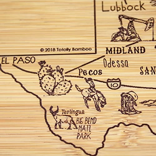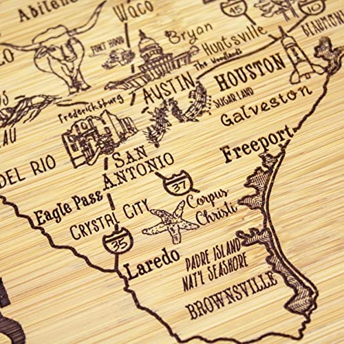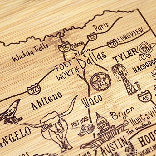 - Savor a slice of The Lone Star State with this beautifully crafted bamboo cutting board that features engraved artwork highlighting the top towns and attractions in Texas