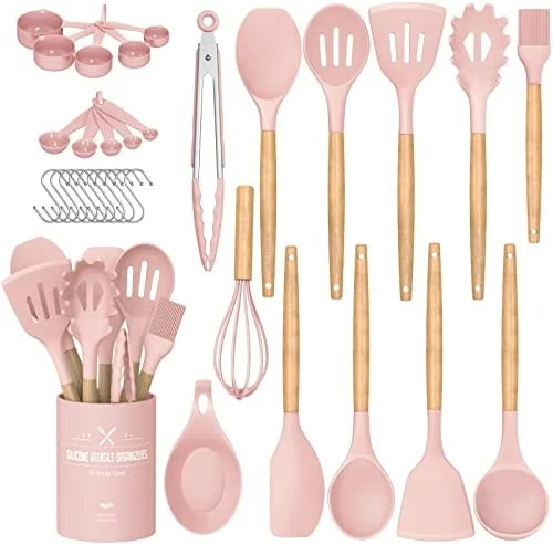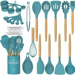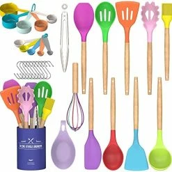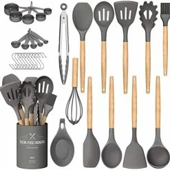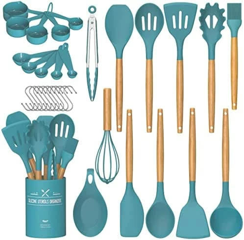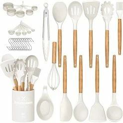 - β 33 DURABLE WOODEN HANDEL KITCHEN UTENSILS SET – Anti scalding protect your hand from burning, 33 professional silicon Kitchen utensil set includeshe set includes flexible spatula, soup ladle,serving spoons pasta server, spatula turner , tongs, mesuring cup and spoons, 10 hooks, silicone mat and so on. Meet your all kinds of kitchen needs