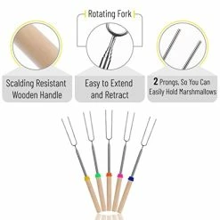 - Package includes 5pcs telescoping marshmallow roasting sticks for your next campfire. The fork is made of stainless steel, and the handle is wood, making it food-grade, rust-proof, heat-resistant, and corrosion-resistant.
