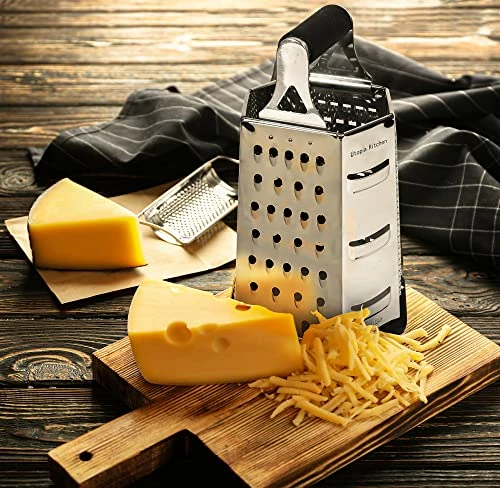- VERSATILE FOOD PREP β The flat grater can be utilized for a number of foods like potato, cheese, zucchini, carrots, cucumber, cabbage, garlic, various fruits and more. The multifunctional kitchen grater is perfect for garnishing baked goods and shaving pieces of chocolate for decadent desserts.