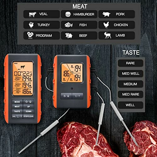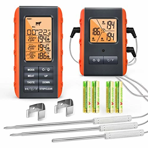 - ใ490ft Stable Signal Connection & Hands Free MonitorใSmoker thermometer with a professional remote signal up to 490 feet, you can watch the game or connect with your family, pets or guests while the remote meat thermometer for grill grilling watches your meat. After rigorous testing, our wireless grill thermometer ‘s signal is strong and stable, reaching 2x farther than a regular connection, 4x more than Bluetooth