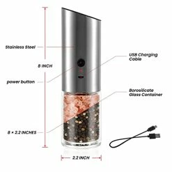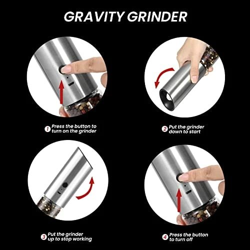- γAUTOMATIC , EASY TO USE γThe stainless steel pepper grinder has a switch button on the cap. You can press the button, and then flipped the grinder .The rechargeable operated salt grinder is gravity activated. The spices powder will come out from top. Pay attention to press the button to turn off the grinder avoiding waste the power by accidental grinding. γUSB Charge Cable γWe have 2 usb charge cables and grinder set together .