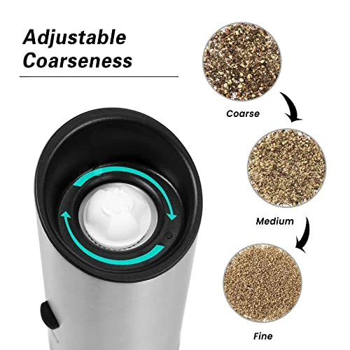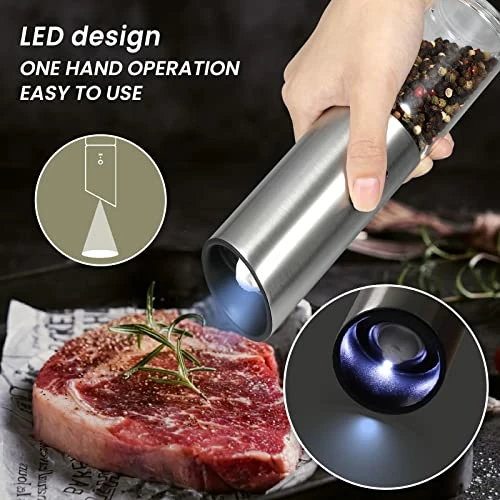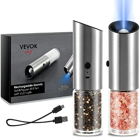 - γHIGH QUALITYγVEVOK CHEF automatic salt and pepper grinder is made of 304 stainless steel and borosilicate glass material. The capacity of the electric spice grinder glass is 140 ml.γWHITE LED LIGHTγour gravity salt and pepper grinder set come with 1 white LED light.The White light makes the eyes more comfortable. we can easy to control the amount of the spice on your food.