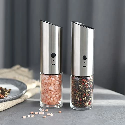 Great Salt and Pepper Grinders, only issue is one of the jars, doesn’t sit flat.I would love it if the company would contact me and send me a new flat Jar to replace the crooked/non-flat Jar.Otherwise, this is a great set of Salt and Pepper Grinders. Nice lite, charge easy and fast. Easy adjustments and provides a wonderful grind.