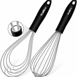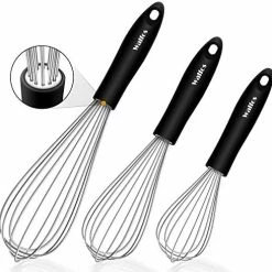 This is a nice set of different-sized whisks at a great price! We like the plastic handles that don’t rust. They are easy to clean. They have more wires than most whisks, making them strong enough to stir heavy batter.
