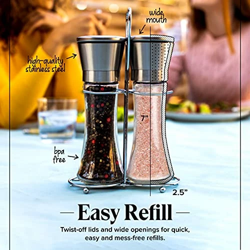 - Refillable: Constant refills making you a little salty? We designed our salt and pepper grinders to be large enough to avoid that mess! The stainless steel top also twists off for easy refill access.