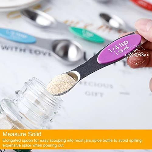 - γMagnetic Measuring Spoons Setγ- measuring spoons set of 8 with spirit level help you measure spices accurately. The double-ended design of the measuring spoon, like a set of two, can fit any bottle mouth. Different sizes: 1/8 tsp, 1/4 tsp, 1/2 tsp, 3/4 tsp, 1 tsp, 1/2 Tbsp, 1 Tbsp plus Leveler. labels allow you to quickly find them while cooking, accurate and easy to read tsp/tbsp and mlοΌclear measurement markings are durable to help prevent fading or washing off.
