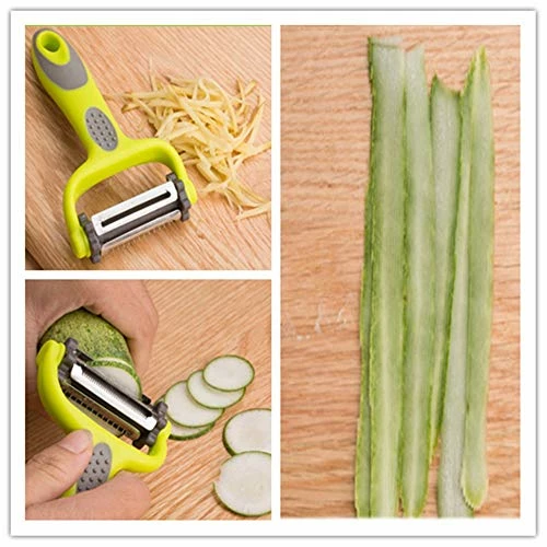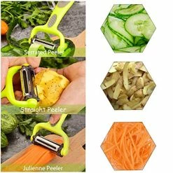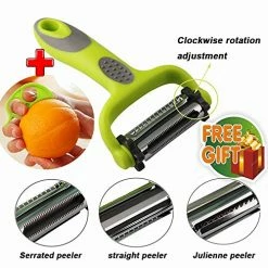- γMulti-functional Fruit &Vegetable Peeler.γ 2 different blades by Serrated blade +Straight blade+Julienne blade.Serrated blade is mainly suitable for soft skins like cucumbers,Tomatoes,kiki fruit etc.Straight blade is mostly used for skin removal.The Julienne blade is great helpful for same-size veggie strip.Really high quality kitchen peeling untensil. Very useful for Apples,Pears,Cantaloupe,cucumbers,Potatoes,Tomato,Carrots,Zucchini,Pumpkin etc.