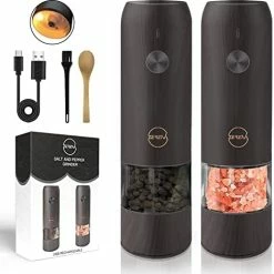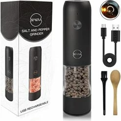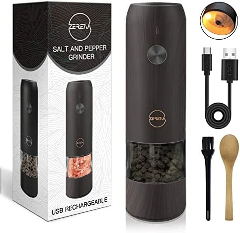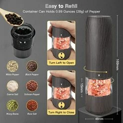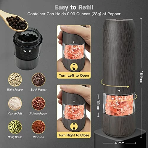 - Easy to Use – One button control, just press the button for easy grinding. One black pepper grinder is only 256g, perfect for one-hand operation. The salt and pepper grinder set have a brush and a wooden spoon for cleaning and refilling.